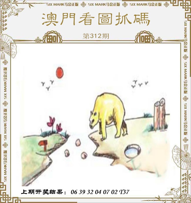 【抓码图】312期:图中一只熊准备过河,后面2个木桩,天上一轮红日,7只大雁,解牛虎兔鸡马狗。